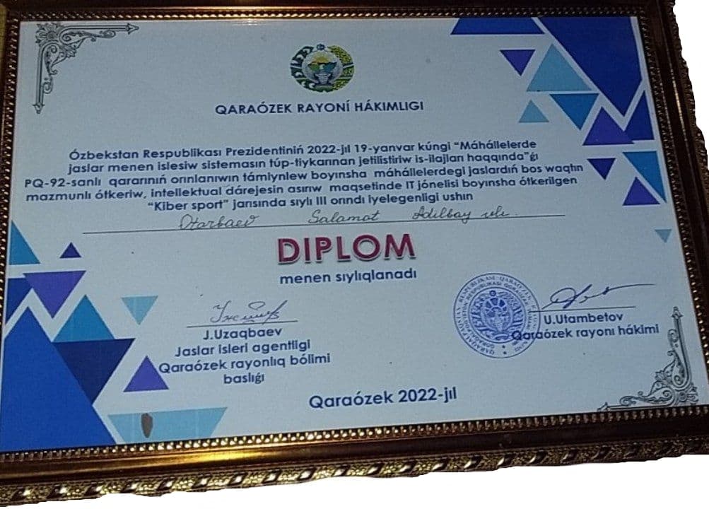 Qaraózek rayonı XBB ne qaraslı 27-sanlı UOBB mektebiniń kadrlar boyınsha menejeri «Qánekey jigitler alǵa — Hayal-qızlarǵa sawǵa» atlı kórik tańlawınıń rayonlıq basqıshına belsene qatnasqanı ushın húrmet jarlıǵı menen sıylıqlandı.