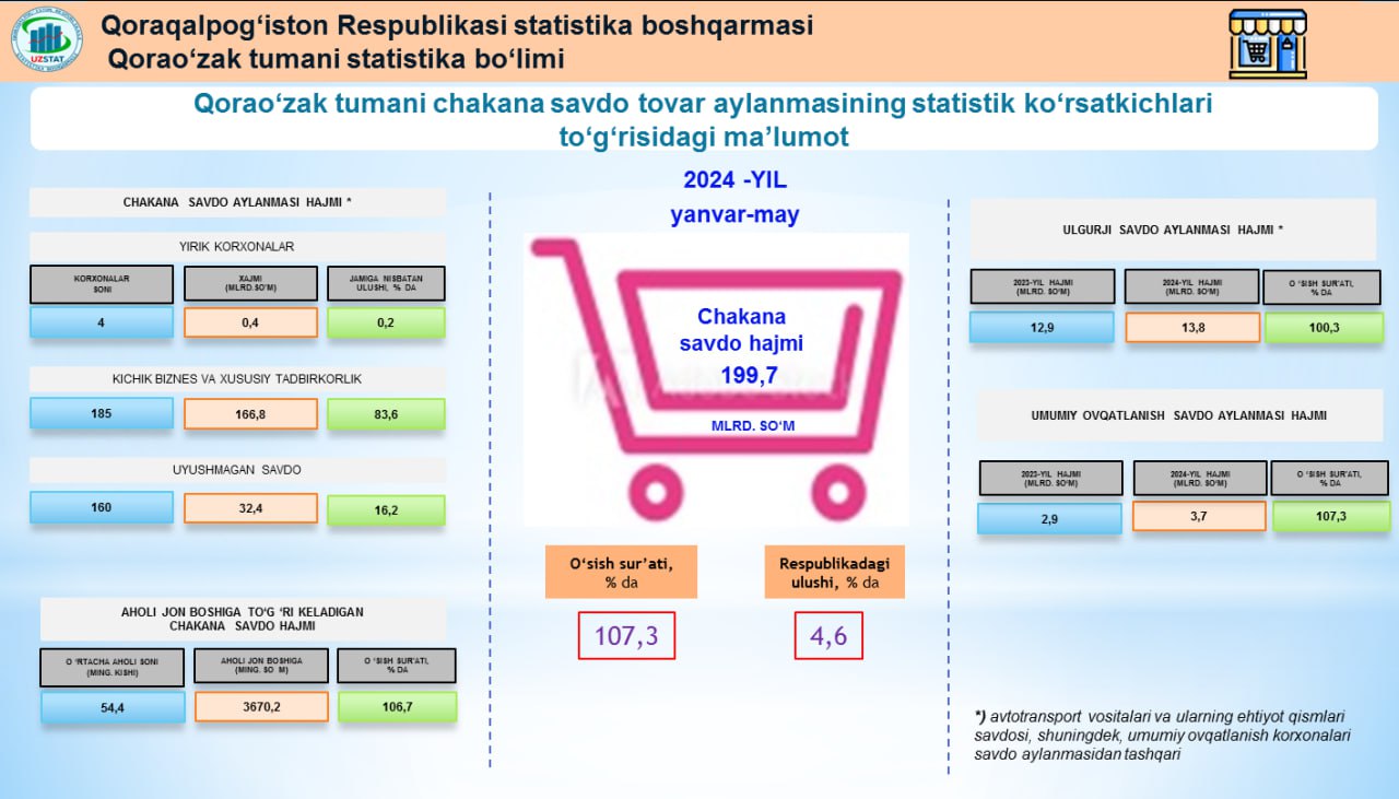 Qaraózek rayonında 2024-jıl yanvar-may aylarında sawda tovar aylanısı boyınsha statistikalıq kórsetkishleri
