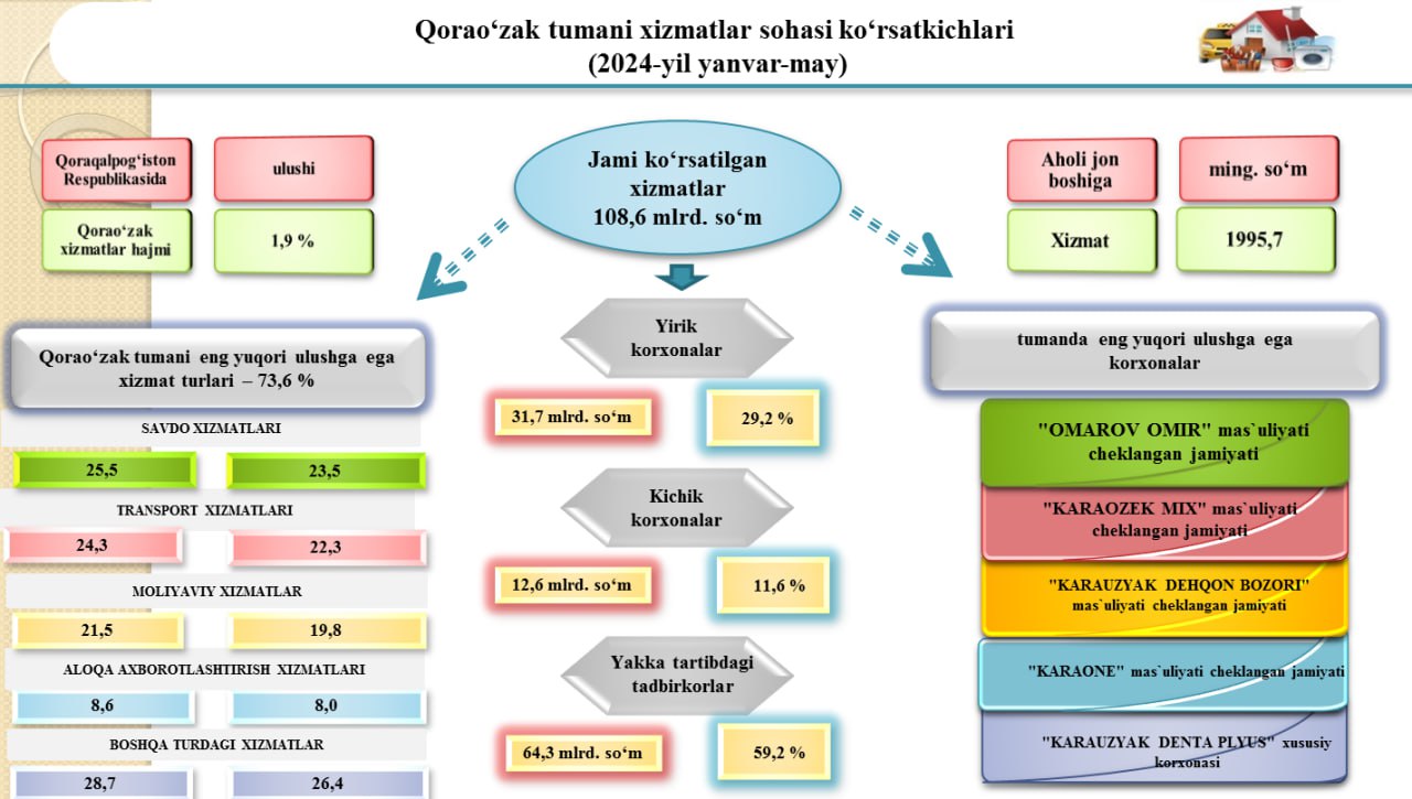 Qaraózek rayonında 2024-jıl yanvar-may aylarında kórsetilgen xızmet túrleri boyınsha statistikalıq maǵlıwmat