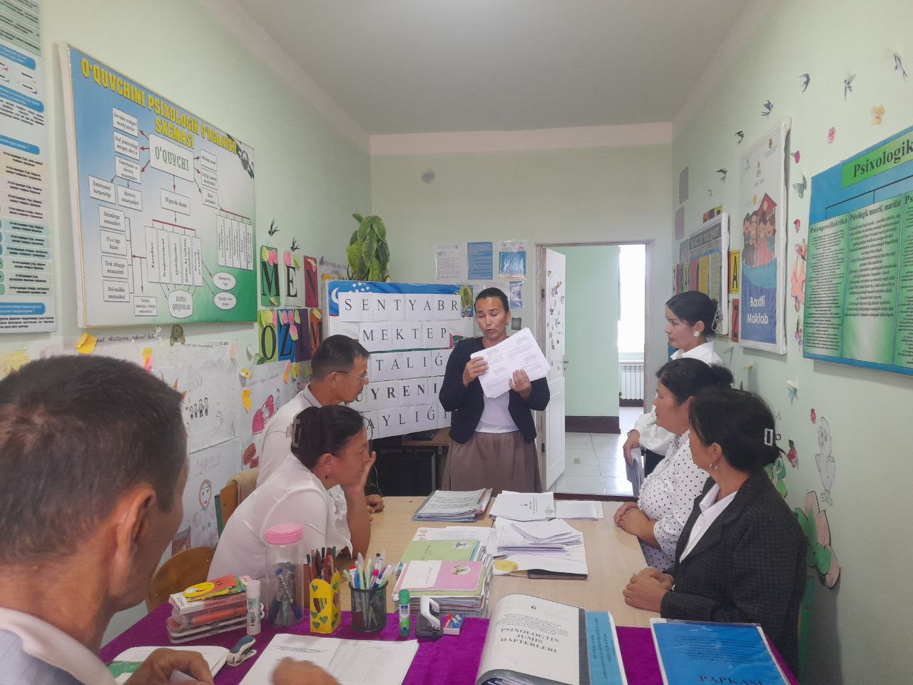 Qaraqalpaqstan Respublikasi Qaraòzek rayoni MSH hàm MBB ne qarasli 27-sanli uobb mektebiniñ àmeliyatshi psixologi: Sh.Paluanova tàrepinen ⚡️⚡️Sentyabr «Mektep ortaliĝin ùyreniw » ayliĝin òtkeriw maqsetinde klass basshilar menen birgelikte mektep oqiwshilariniñ sotcialliq psixologiyaliq portretin tayarlaw boyinsha sàwbetlesiw,klass basshilardiñ kepillik xati haqqinda oqiwshilardiñ psixologiyaliq jaĝdaylari haqqinda hàr hàpte jazba bildiriw berip bariw boyinsha tùsinik jumislari alip barildi.